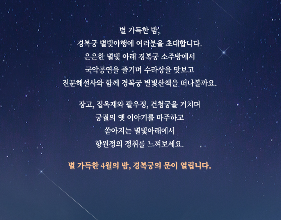 경복궁 야간개장행사인 별빛야행은 2024년 4월 3일 수요일부터 5월 4일 토요일까지 진행됩니다.