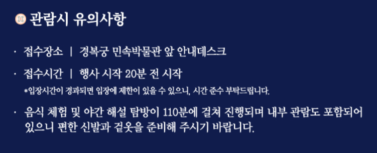 - 음식체험 및 야간 해설 탐방이 110분에 걸쳐 진행되니 편한 신발과 겉옷을 준비해 주세요.