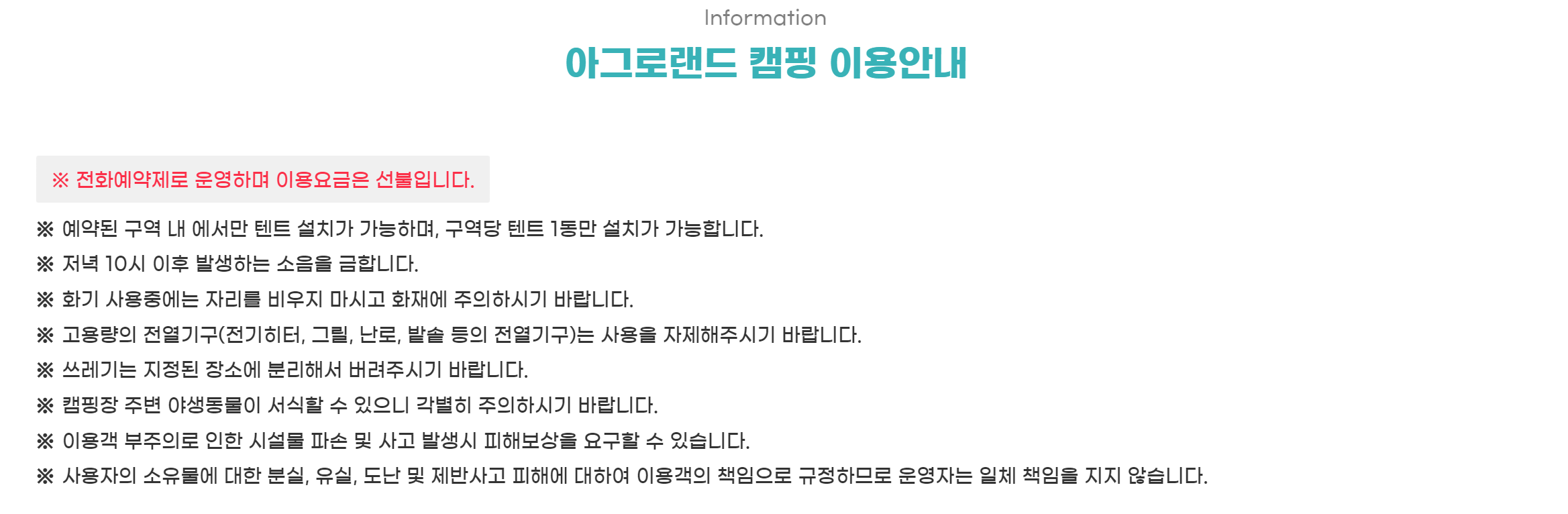 아그로랜드 캠핑은 전화예약제로 운영하고 있습니다. 이용요금은 선불입니다.