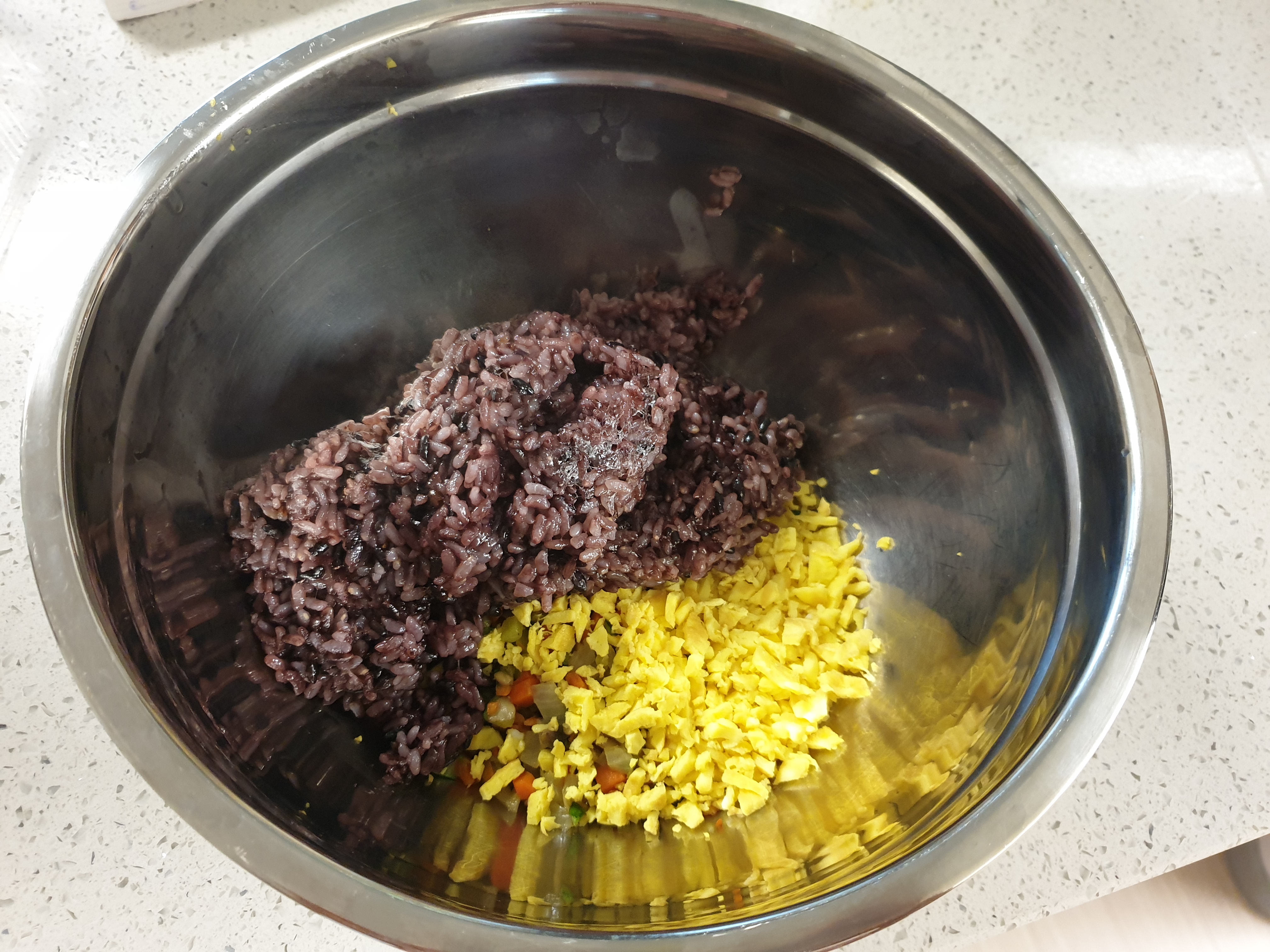 볶아준 야채와 계란을 볼에 넣고 1 공기 반 정도 양의 밥을 함께 넣어줍니다.