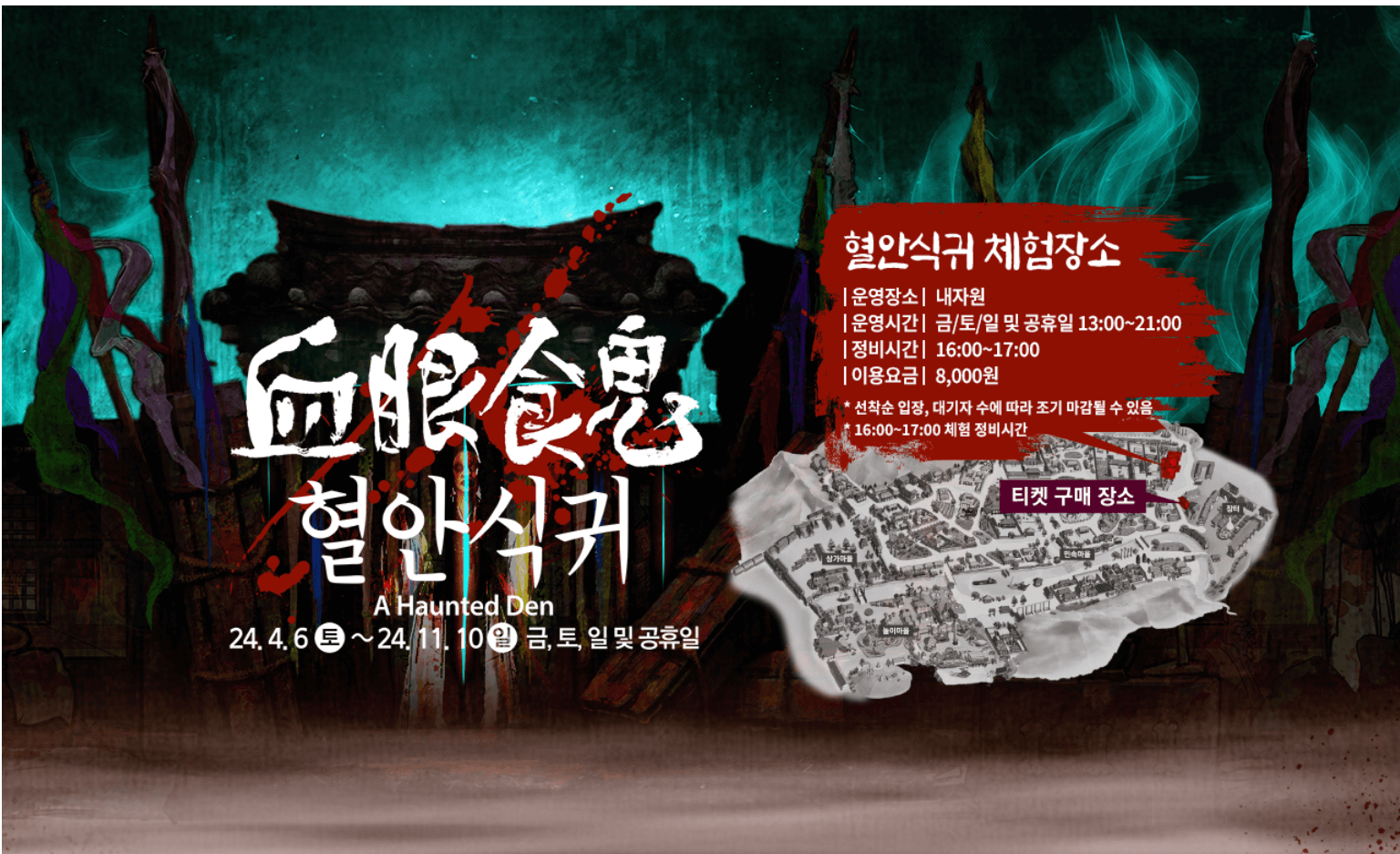 한국민속촌에서 즐길 수 있는 공포체험 '귀굴 : 혈안식귀'가 4월 6일 토요일부터 11월 10일 일요일까지 금, 토, 일 및 공휴일에 진행됩니다.