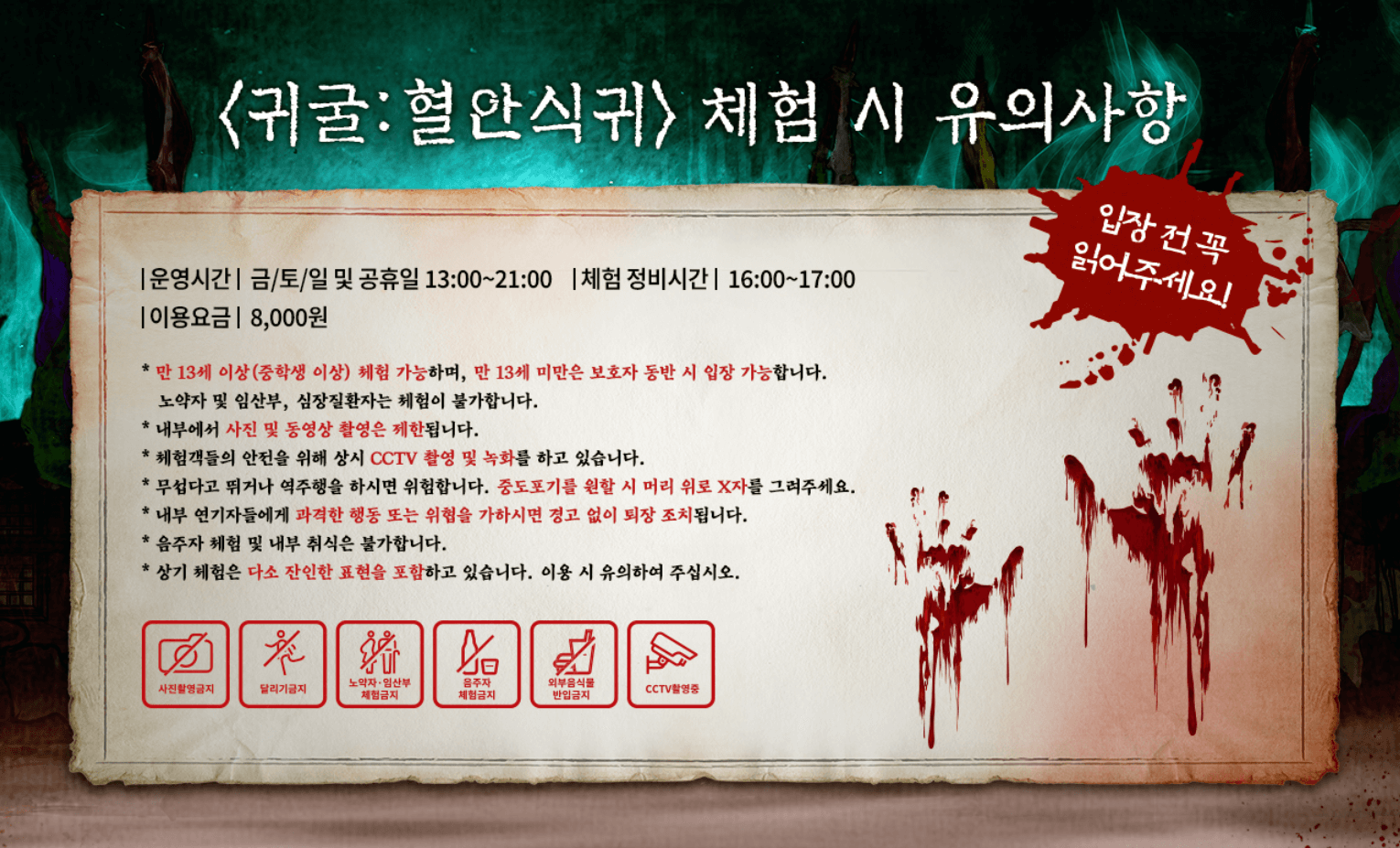 공포체험 혈안식귀는 금/토/일 및 공휴일 13시~21시까지 진행됩니다.