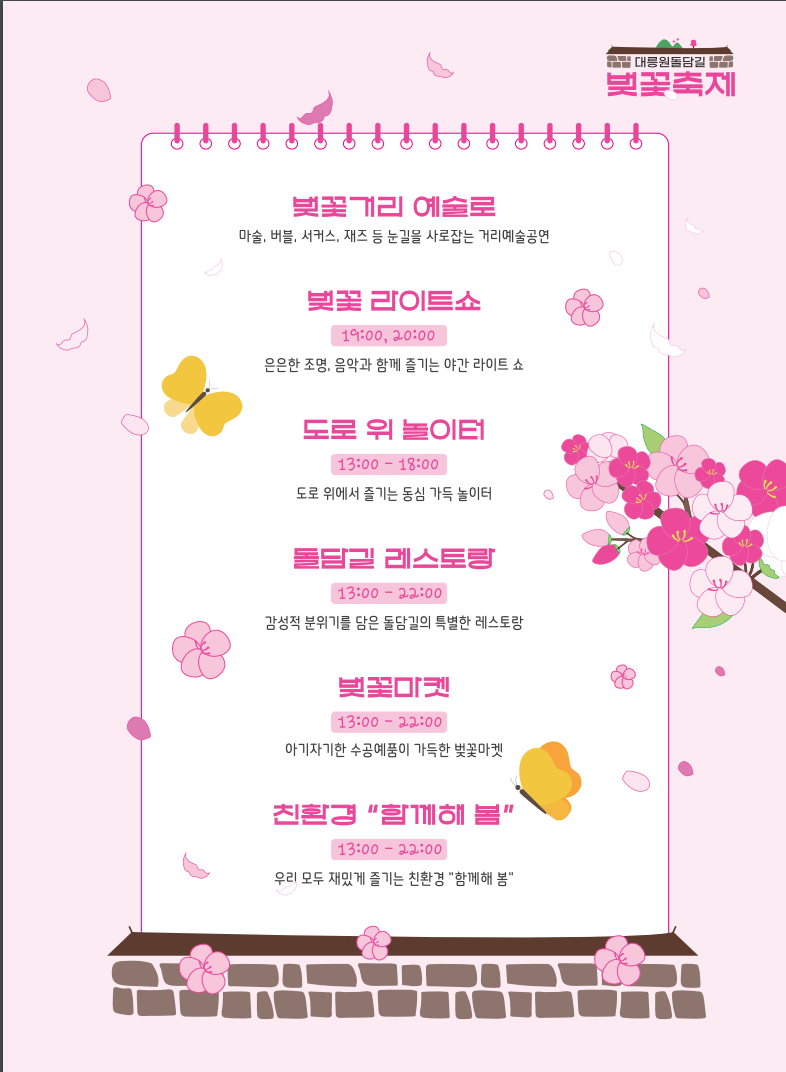 대릉원 돌담길 벚꽃축제는 벚꽃거리예술로, 벚꽃라이트쇼, 벚꽃 포토존등 다양한 프로그램을 준비하였습니다.