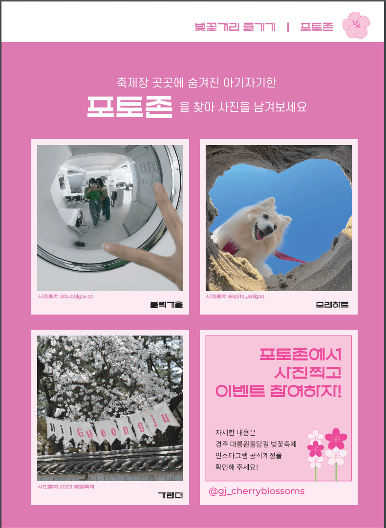 경주대릉원돌담길벚꽃축제의 축제장 곳곳에 아기자기한 포토존이 숨겨져 있습니다. 포토존을 찾아 사진 찍으면 이벤트에 참여하실 수 있습니다. 포토존이벤트의 자세한 사항은 인스타그램 공식계정(@gj_cherryblossoms)을통해 확인하실 수 있습니다.