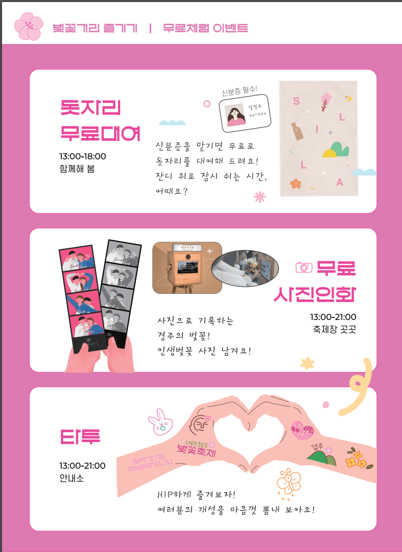 경주대릉원돌담길벚꽃축제에서는 무료체험이벤트와 포토존이벤트를 진행할 예정입니다.