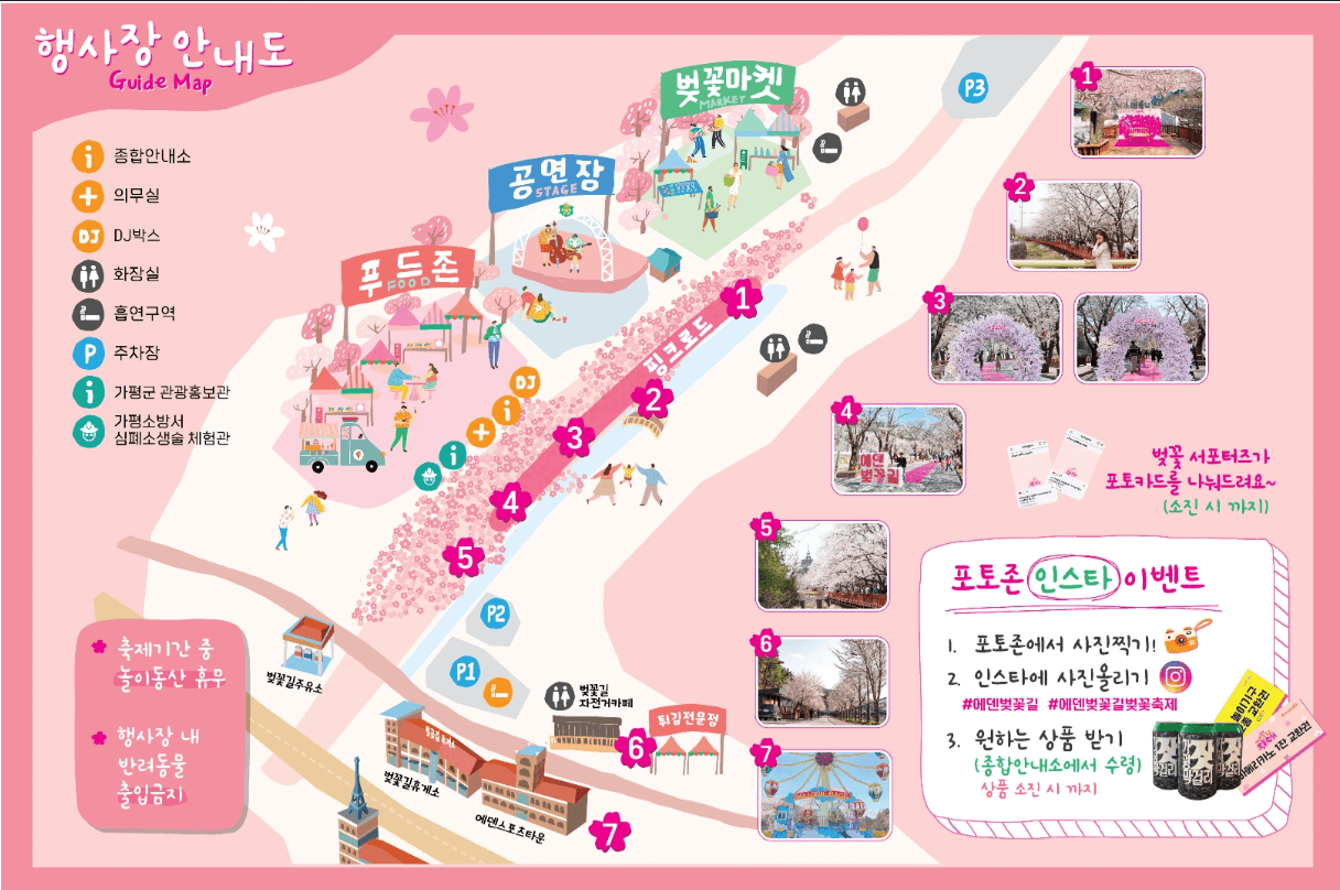 가평벚꽃축제에 푸드존과 플리마켓등 다양한 볼거리와 먹을거리가 있어서 즐거운 시간을 보내실 수 있습니다.