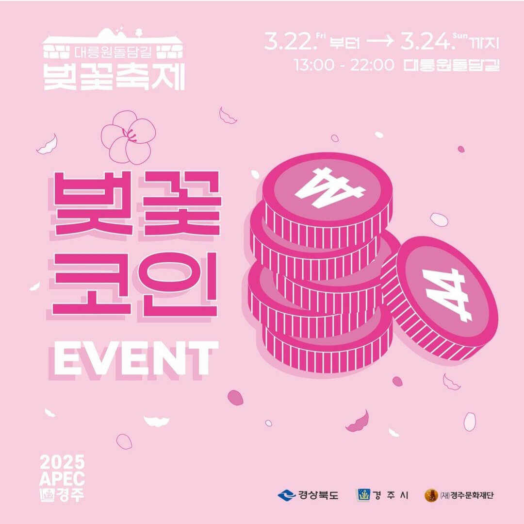 경주 대릉원 돌담길에서 열리는 벚꽃 축제는 벚꽃거리예술로, 벚꽃라이트쇼, 벚꽃 포토존등 다양한 프로그램을 준비하였습니다. 이번 경주 대릉원돌담길 벚꽃축제에서는 벚꽃코인 이벤트를 실시합니다. 벚꽃코인이란 폐병뚜껑을 사출해 만든 경주 대릉원돌담길 벚꽃축제만의 '코인'입니다. 축제의 "함께해 봄" 부스에서 친환경 이벤트에 참여하면 벚꽃코인 1개를 받으실 수 있어요. 벚꽃코인으로 벚꽃마켓 또는 푸드트럭에서 1만 원당 1천 원 할인이 되고, 도로 위 놀이터에서 업사이클링 특별한 체험을 할 수 있습니다. 함께해 봄 에코백 만들기 등 특별한 체험이 가능하니 참여하셔서 특별한 추억을 만들어 보세요.