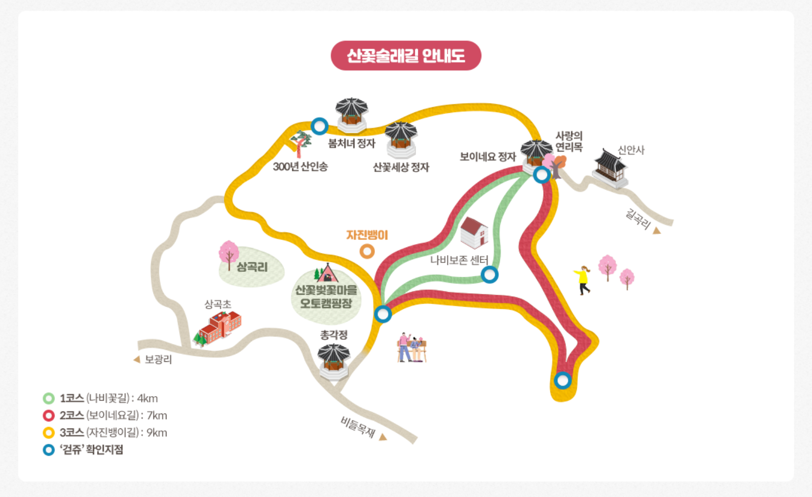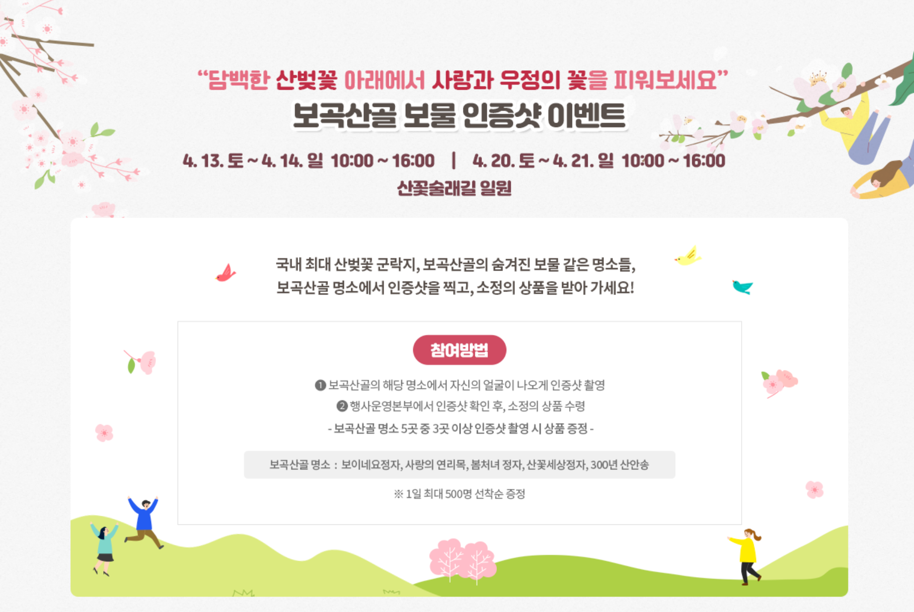 4월 13일 토요일~ 4월 14일 일요일 10시~16시, 4월 20일 토요일 ~ 4월 21일 일요일 10시 ~ 16시 산꽃술래길 일원에서 보곡산골 명소 5곳 중 3곳 이상 인증샷 촬영 시 상품을 증정하는 '보곡산골 보물 인증샷 이벤트'도 진행됩니다.