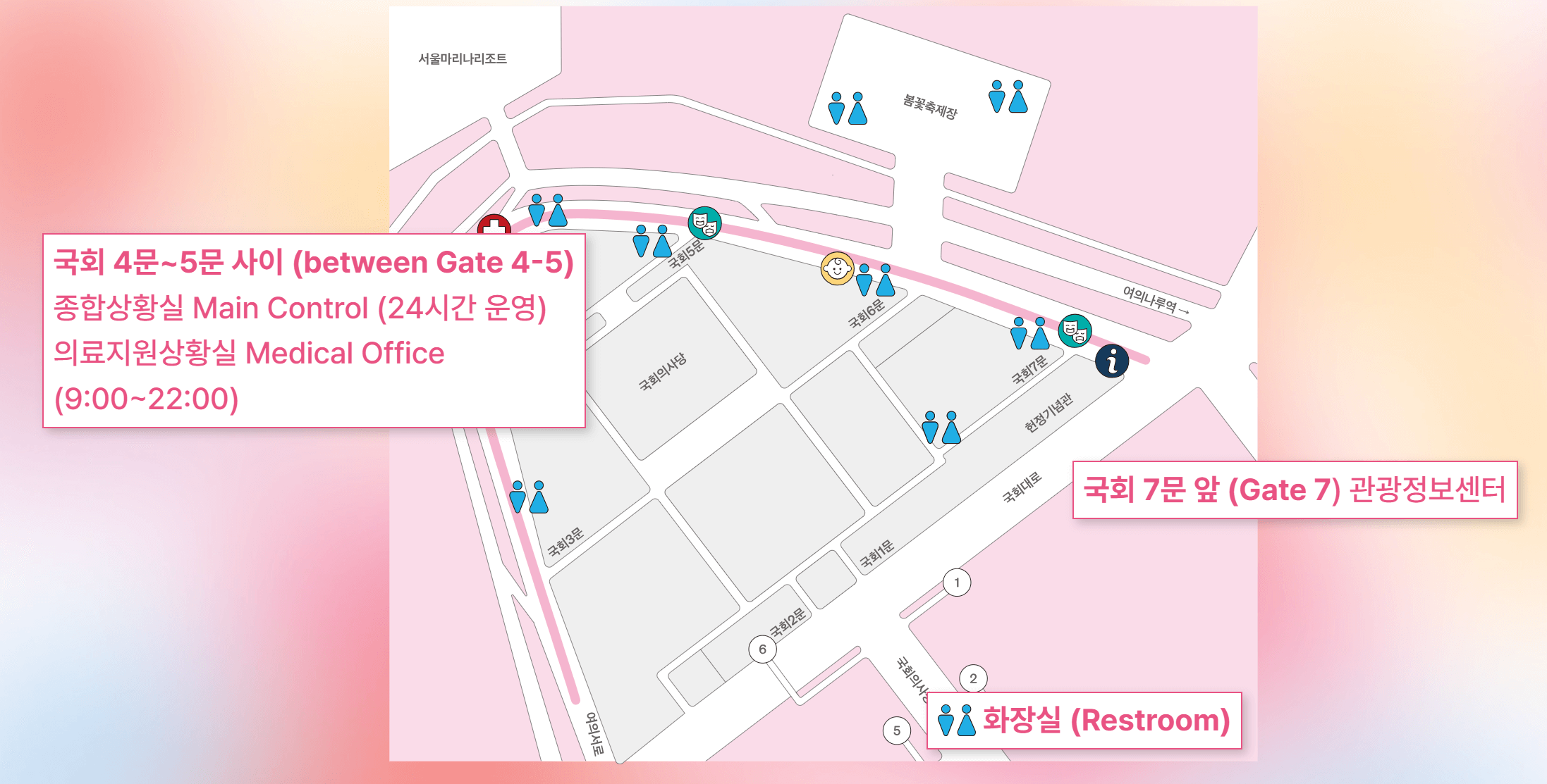 여의도벚꽃축제에서는 외국어 안내가 가능한 관광센터운영과 함께 가족단위 방문객들을 위해 유모차(유아차)와 유아웨건 대여서비스를 제공할 예정이라고 합니다. 아이를 위한 아기쉼터(수유실)도 준비되어 있습니다.