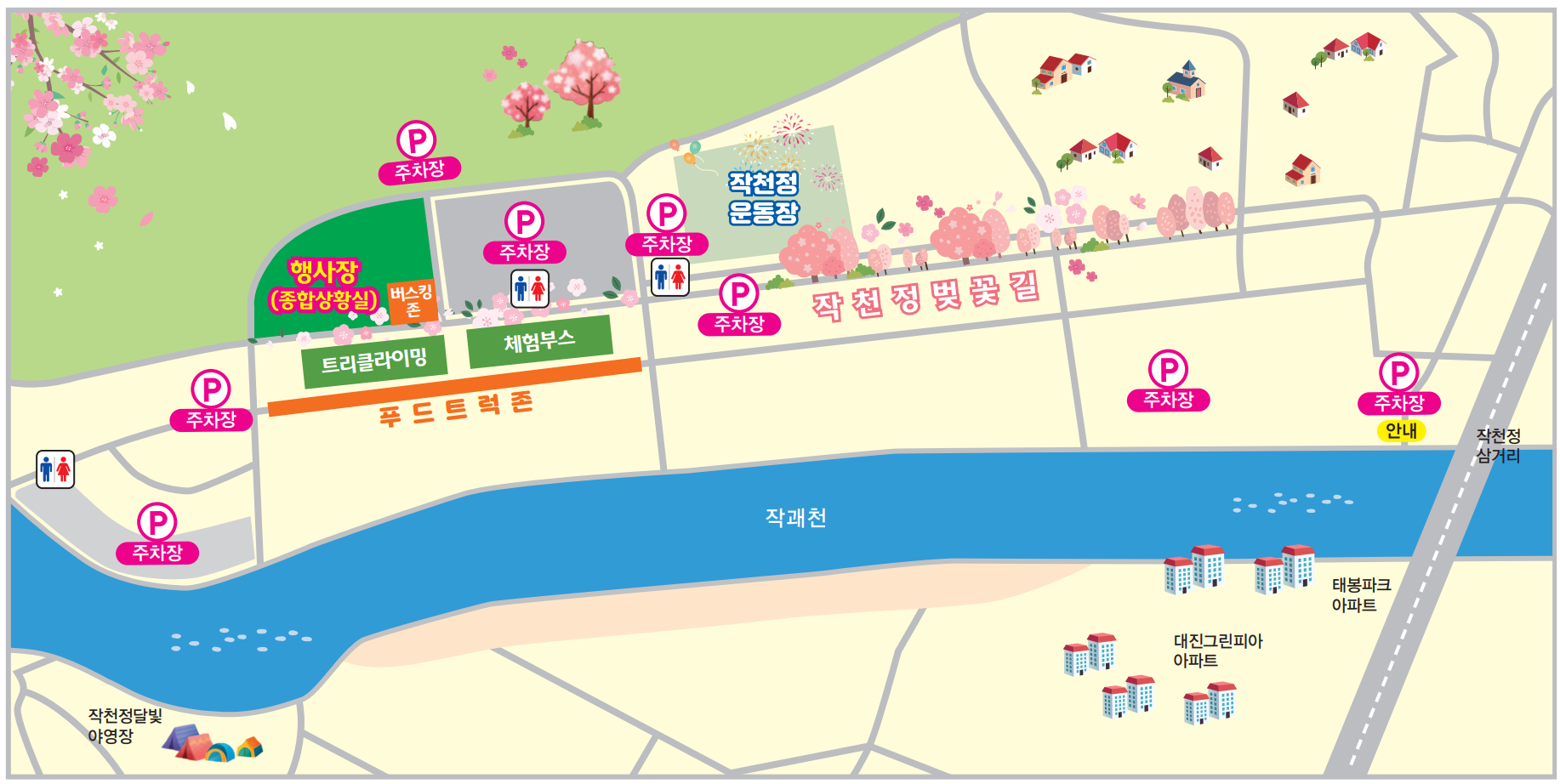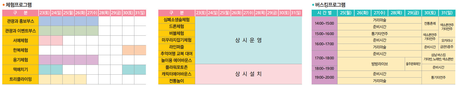 울주작천정벚꽃축제에서는 서예체험, 한복체험, 떡메 치기, 트리클라이밍, 심폐소생술체험, 드론체험, 버블체험, 추억여행 교복대여, 놀이용 에어바운스, 캐릭터에어바우스, 전통놀이등 여러 가지 체험프로그램과 버스킹공연, 플라워포토존이 준비되어 있습니다.