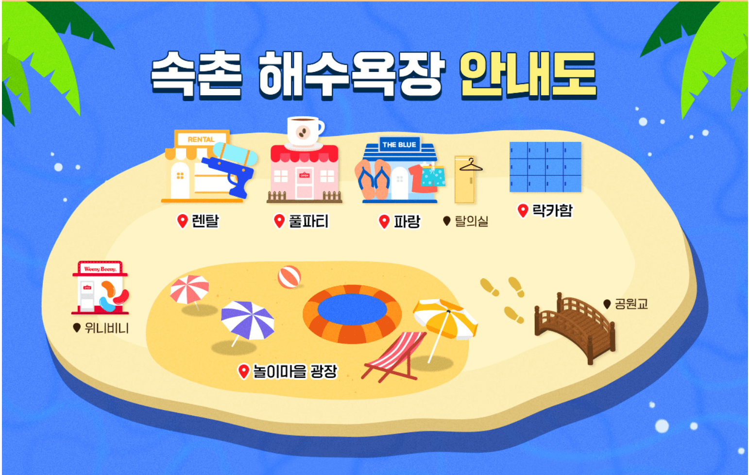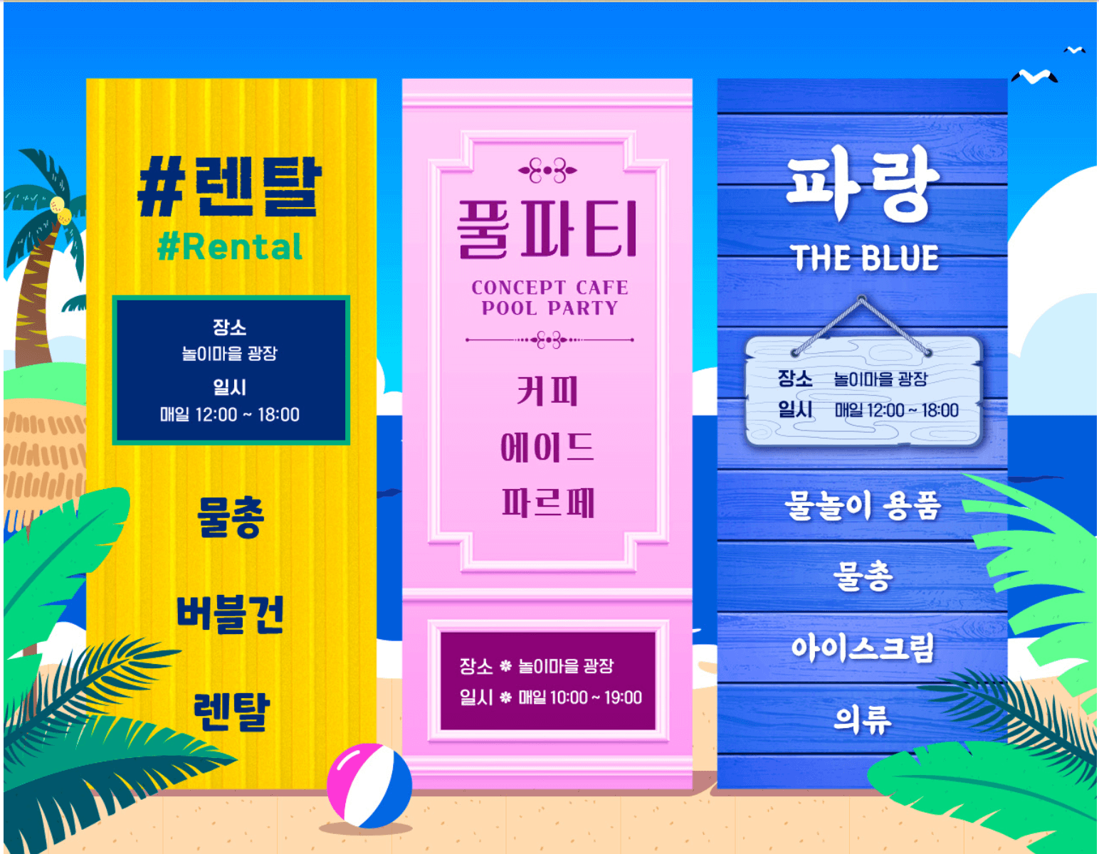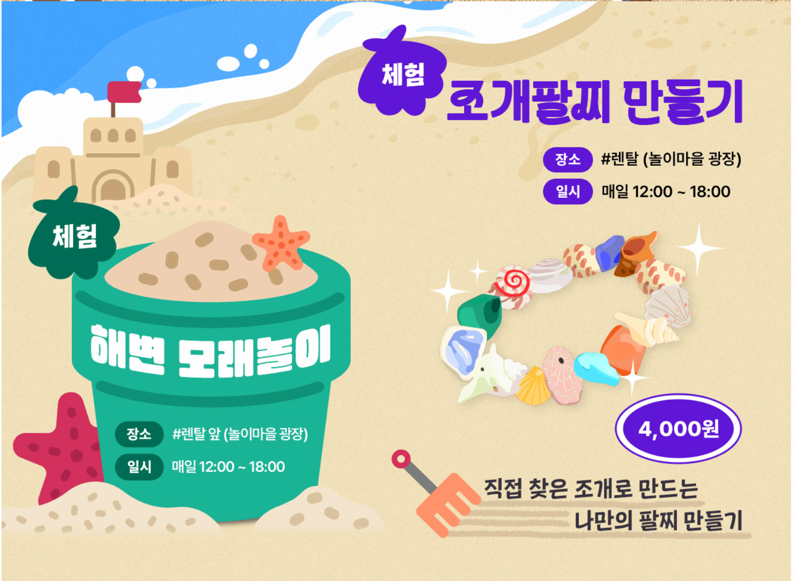 놀이마을에서는 해변 모래놀이, 조개팔찌 만들기등의 체험프로그램과 컨셉스토어가 매일 12시~ 18시에 진행됩니다.