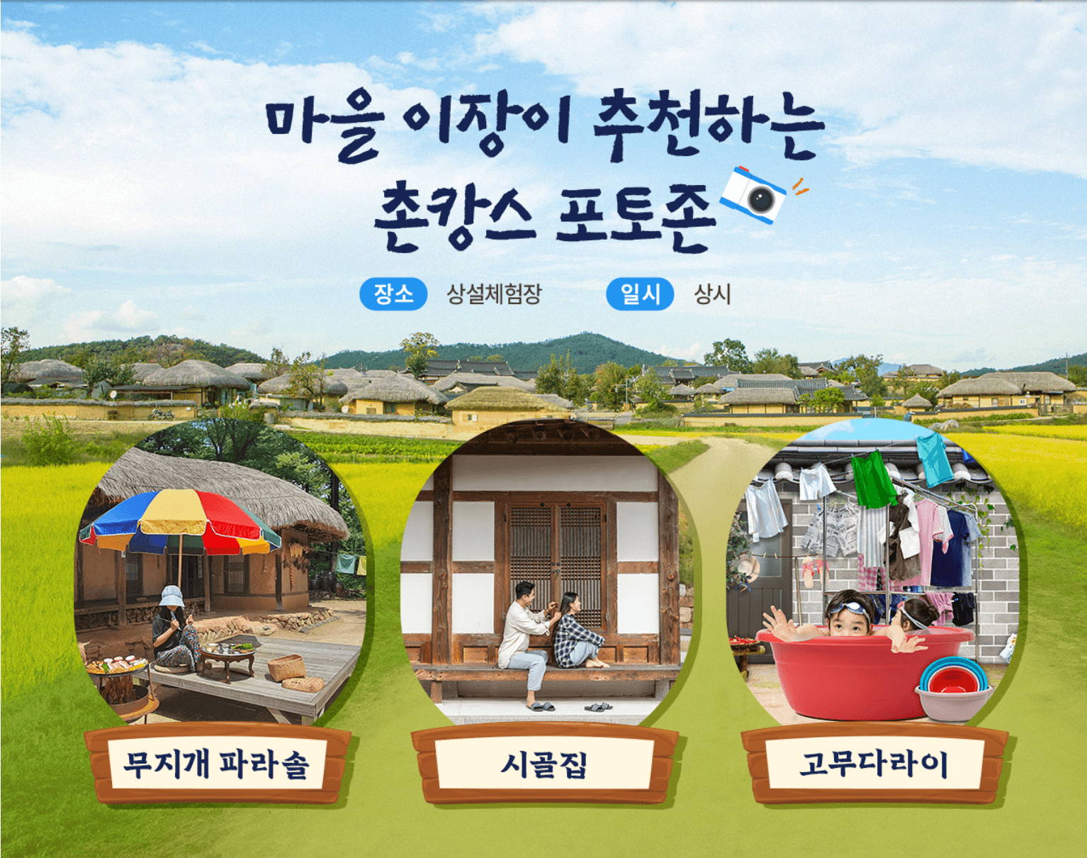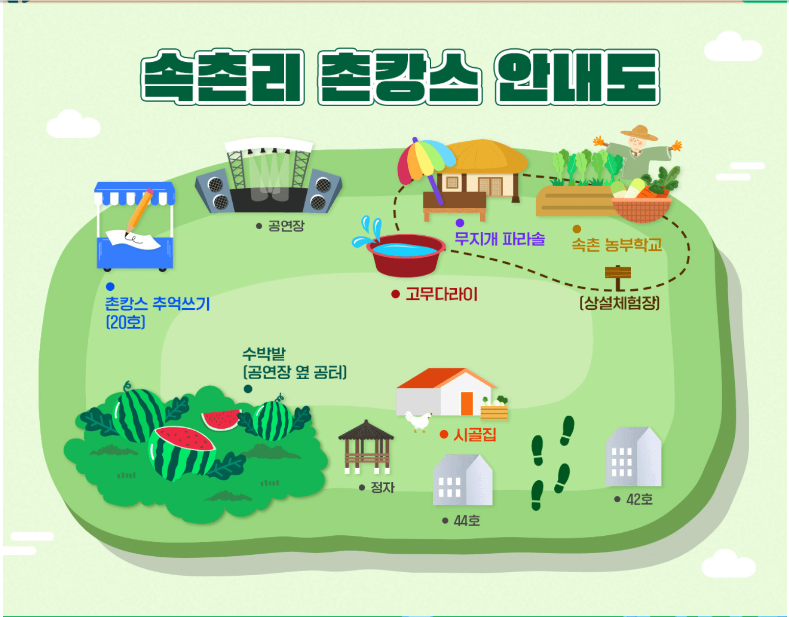 민속마을에서는 수박서리 이벤트가 매일 13시에 진행되고 대나무 물총만들기, 밀짚모자 꾸미기 촌캉스 추억쓰기등의 체험 프로그램을 매일 12시~18시에 참여하실 수 있습니다. '무지개 파라솔', '시골집', '고무다라이' 포토존은 상시로 열려있습니다.